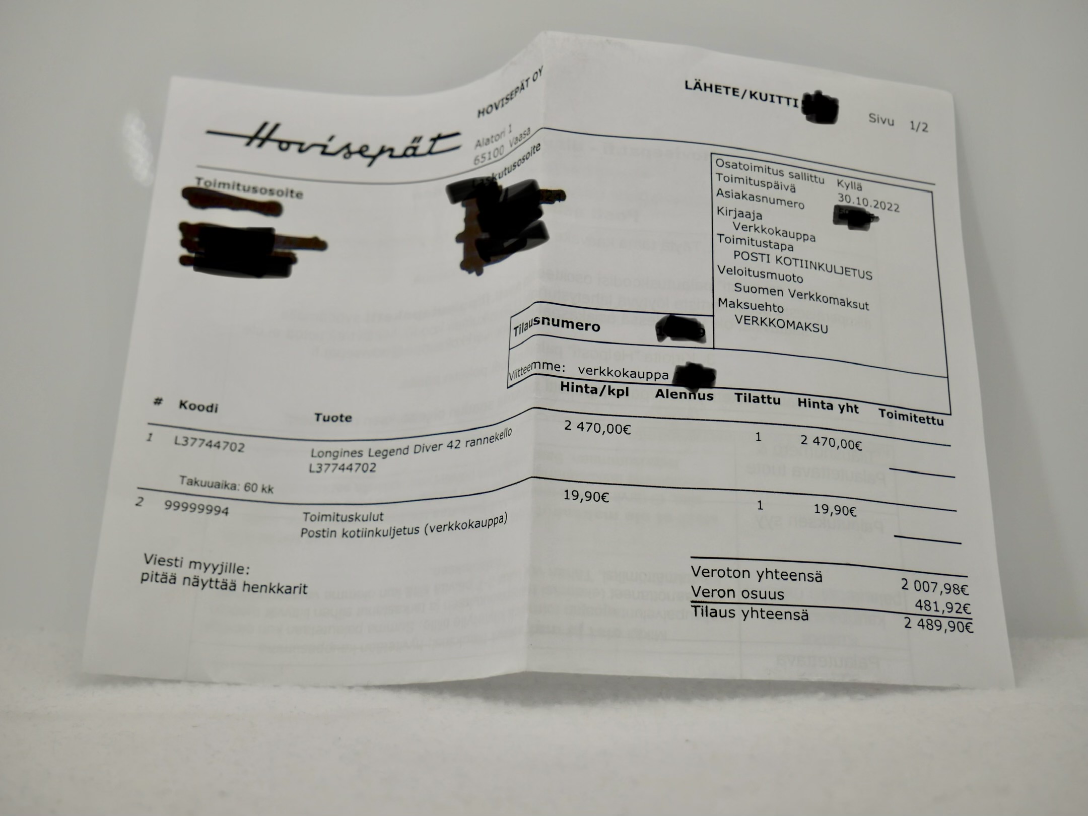 • Alkuperäinen tilauskuitti (30.10.2022)