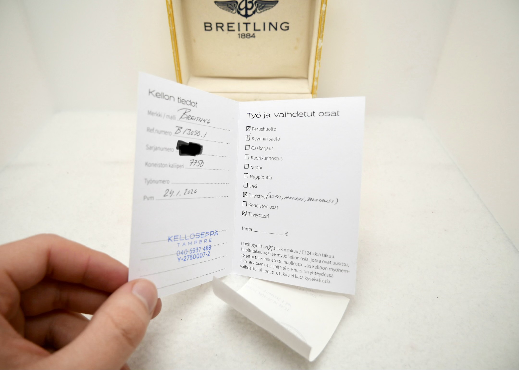 Myynnissä ikoninen Breitling Chronomat, ref. B13050.1 – yksi Breitlingin tunnetuimmista ja arvostetuimmista kronografimalleista. Tämä yksilö on juuri huollettu, ja se myydään alkuperäisillä papereilla (päivätty 12/1994) sekä alkuperäisellä laatikolla.